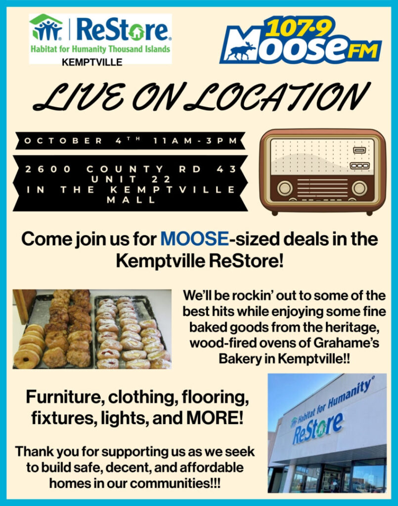 107.9 MOOSE FM Live on Location! by Doug Elliott | Sep 17, 2025 | News The MOOSE is LOOSE at the Kemptville ReStore!
